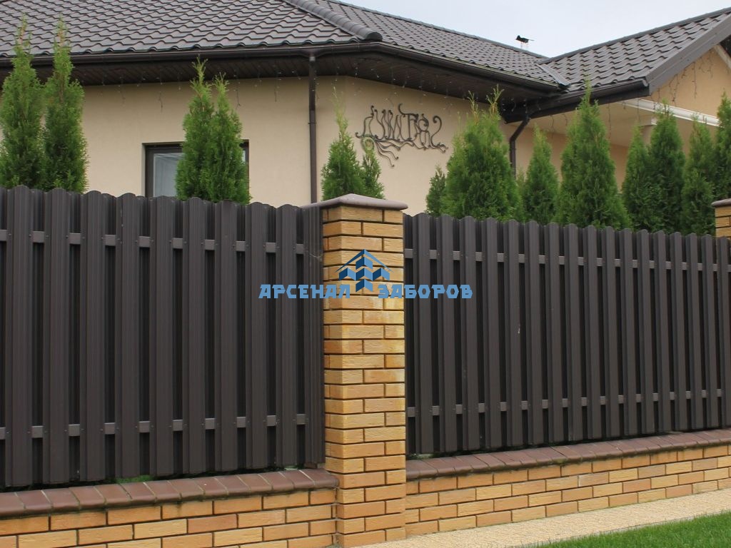Забор из евроштакетника с кирпичными столбами