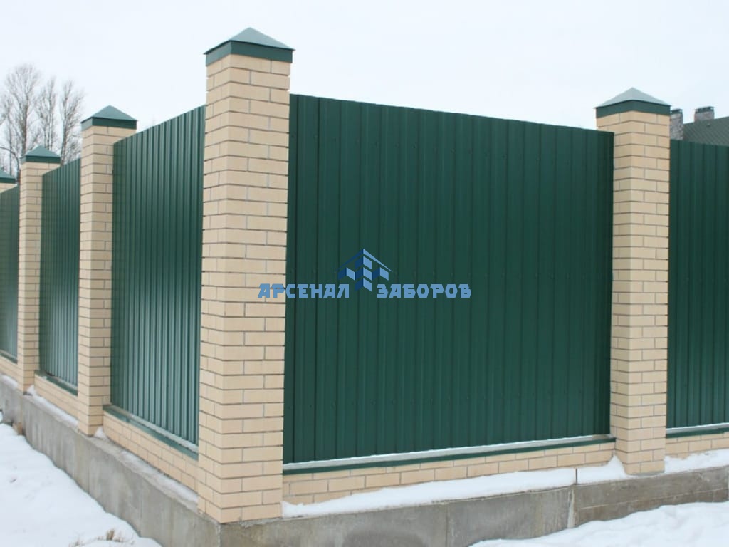 Конструкция забора из профлиста на ленточном фундаменте и с кирпичными столбами