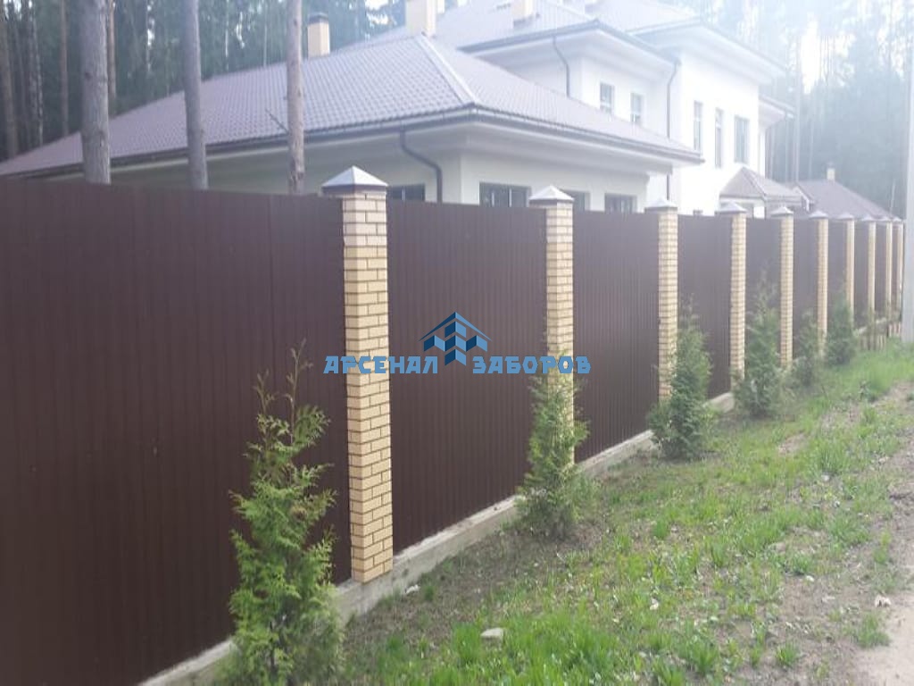 Конструкция забора из профлиста на ленточном фундаменте и с кирпичными столбами