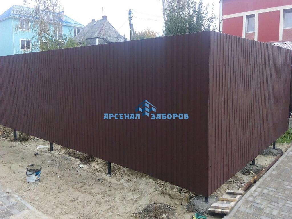 Конструкция забора из профлиста на ленточном фундаменте и с кирпичными столбами