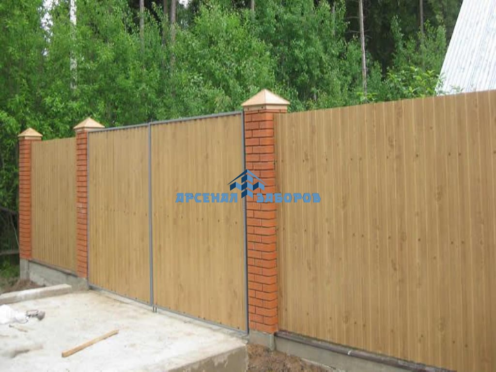 Конструкция забора из профлиста на ленточном фундаменте и с кирпичными столбами